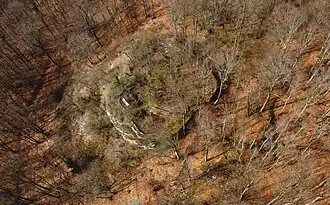 Der Graben liegt an der Nordostseite der fast kreisrunden Burgfläche. Die gegenüberliegenden Seiten waren durch den senkrechten Abfall der Felswand vor einem Angriff geschützt.