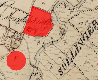 Lageplan des Burgstalls Geratspoint (links unten) auf dem Urkataster von Bayern; oben Mitte ist die Lokalisation von Schloss Geratspoint eingetragen | |