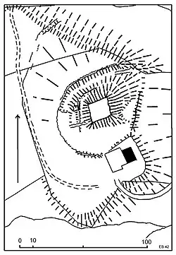 Durch die Baumaßnahmen für das Munitionslager ist von den 1942 noch skizzierten Wällen der Vorburg nichts mehr übrig geblieben, auch nicht vom ehemaligen „Gschrifter“, dem Anwesen des Josef Waibel.