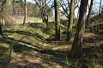 Es handelte sich vermutlich um eine Erdhügelburg, die am Rande des heute nicht mehr existenten Dorfes Hluboký stand und von der nur die Reste der Erdbauten erhalten sind. Der ovale Burgstall mit Ringwall und Graben hat eine Ausdehnung von 53 × 47 m, wobei die Nord-Süd-Achse die längere ist.[3] Den Kern bildet ein ursprünglich 6–10 m hoher Hügel mit einer Abmessung von 18 × 15 m, der sich heute viereinhalb Meter über der Grabensohle und zweieinhalb Meter über dem umgebenden Gelände erhebt. Der in späterer Zeit mehrfach durchbrochene Ringwall hat nur noch eine Höhe von einem Meter. Um 1900 konnte Wenzel Rott teils noch bereits verdeckte Spuren von Mauerwerk erkennen. Von der Bauart und Größe ist sie dem Hradischken bei Vidhostice sehr ähnlich.