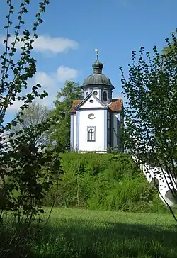 Der kuppelgekrönte Barockbau ersetzte eine ältere, 1641 als Martersäule erwähnte Andachtsstätte. Ein Teil des zugehörigen gemauerten Bildstockes wurde in die Mensa des Kapellenaltares integriert.