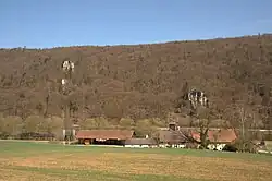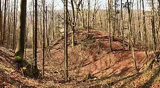 ![]() Burgstall Lichtenroth – Ansicht des Burghügels über den Halsgraben | ||