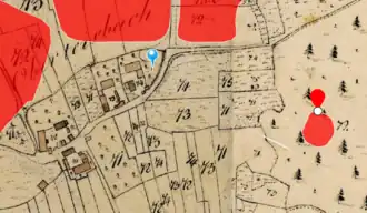 Lageplan des Burgstalls Obertaisbach auf dem Urkataster von Bayern (Mitte rechts) | ||