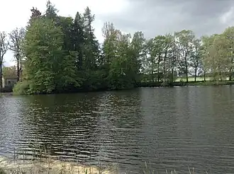 Der Burgstall von Schönficht im aktuellen Zustand (Mai 2015). Der ehemalige Burggraben wurde in nordöstlicher Richtung zum Teich erweitert, auf der Gegenseite ist der Graben noch erhalten, der Burgstall liegt damit auf einer Insel. | ||