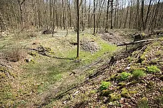 Die Ostseite geht dagegen fast eben in die Hochfläche über, so dass dort ein Graben angelegt werden musste. Dieser Abschnittsgraben (Bild 3) war etwa 35 Meter lang und 13,5 Meter breit. Sein äußerer Grabenrand zur Hochfläche liegt 1,9 bis 2,3 Meter über der Grabensohle, der innere liegt wesentlich höher, etwa 2,7 bis 3,8 Meter über der Sohle (Bild 4). Der Graben, von dem kein Abraumhügel erkennbar ist, verläuft in flachem Bogen um die Vorburg und läuft an beiden Enden, die jeweils leicht nach innen eingezogen sind, im Hang aus. Im nördlichen Bereich dieses Grabens sind noch 1,5 Meter lange Reste von Trockenmauerwerk erhalten.