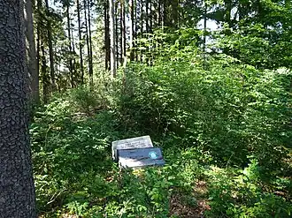 Gedenkstein mit Inschrift „Burgstall Burgstumpf, Sitz des Ritters Veit von Eisenburg 1442 vom Ritter Hans von Stadion niedergebrannt.“