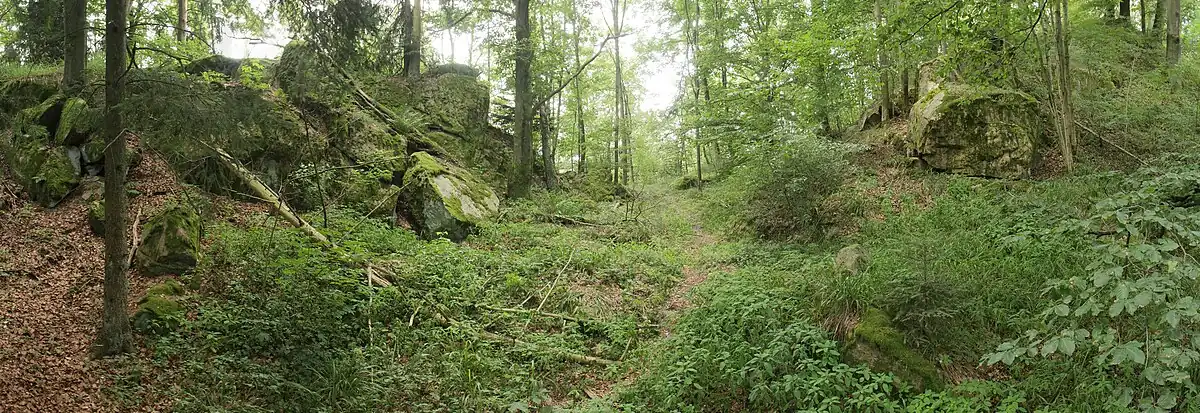 Burgstall Warberg – Schichtwasserbrunnen im Halsgraben (Juli 2013) | ||