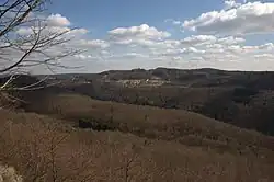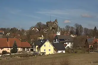 Burgstall Wichsenstein – Ansicht des Burgfelsens über dem Dorf aus südlicher Richtung (März 2011) | ||
