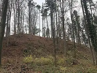 ![]() Burghügel, links der Standort des Turms | ||