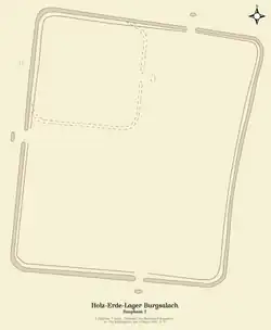 1978 wurde durch den Luftbildarchäologen Otto Braasch rund 350 Meter südöstlich des Kleinkastells ein weiteres, ein Hektar großes rechteckiges, zweiphasiges Lager mit abgerundeten Ecken entdeckt, das mit seinen Schmalseiten ungefähr nordsüdlich orientiert war.[27] Die Römerstraße zieht südwestlich an der Anlage vorbei.[28] Allem Anschein nach nimmt die Befestigung auf diese Trasse Rücksicht, was eine nähere zeitliche Stellung zulassen könnte. Der Platz wurde auch in den darauffolgenden Jahren beflogen. Im Sommer 1983 zeigte sich erstmals ein kleines, sich abgrenzendes Geviert des älteren Holz-Erde-Lagers in der Nordwestecke der auf einem sehr mageren Boden errichteten Befestigung. Im April 2008 wurde das gesamte Gelände unter der Leitung des Geophysikers Jörg Faßbinder vom Bayerischen Landesamt für Denkmalpflege magnetometrisch untersucht.[29]