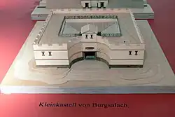 In seiner architektonischen Gestaltung wurden am gesamten obergermanisch-rätischen Limes bisher keine vergleichbaren Fortifikationen beobachtet. Wie der Archäologe Wilhelm Schleiermacher (1904–1977) 1962 feststellte, war der karreeförmige Grundriss der Burgsalacher Anlage „schon immer“ mit spätrömischen Befestigungsbauten in Kleinasien oder Nordafrika verglichen worden,[15] wobei speziell die nordafrikanischen Parallelen stets hervorgehoben wurden. Dort entdeckte man römische Militärlager, die in ähnlicher Grundrissplanung aus dem frühen 4. Jahrhundert stammen. Außerdem ist von dort auch der lateinische Name dieses Wehranlagentyps inschriftlich überliefert: Er wird Centenarium genannt. Eventuell steht seine Errichtung mit der Anwesenheit von Angehörigen der Legio III Augusta aus Lambaesis in Africa in Zusammenhang. Die Legion war im Zuge von Machtkämpfen unter den Gordianenkaisern aufgelöst und ihre Mannschaften in verschiedene Provinzen strafversetzt worden. Bei dieser Gelegenheit könnten die in Raetien stehenden Truppenteile diese Befestigung errichtet haben, was sich allerdings nicht beweisen lässt. Die Legion fiel damals unter die damnatio memoriae und durfte dementsprechend auch keine Bauinschriften mit ihren Namen hinterlassen.[16]