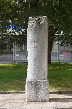 Der im Jahr 1865 gefundene, aus der Regierungszeit des Kaisers Septimius Severus (193–211) und seiner Söhne stammende Meilenstein[27] machte den Fundort auch überregional bekannt.[28] Er steht heute nahe der Marienkirche in Vöcklamarkt. Die letzte Zeile der Inschrift nennt die Entfernung des einstigen Aufstellungsortes von Iuvavum: AB IVVAO M XXXI, ab Iuva(v)o m(ilia passuum) XXXI, diese 31 römische Meilen (etwa 46 km), entsprechen der Entfernung von der Altstadt von Salzburg nach Mösendorf, wenn man auch den Verlauf der Bundesstraße B1 miteinbezieht, die über große Strecken noch heute der römerzeitlichen Trassenführung entspricht bzw. nur wenig davon abweicht. Der Fundplatz des Meilensteines dürfte sich also in der Nähe seines ursprünglichen Standortes befunden haben.[29]