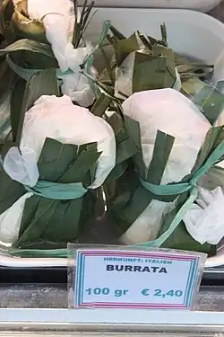 Burrata ist eine Sonderform des Mozzarella, wird aber überwiegend aus Kuhmilch (seltener aus Büffelmilch) hergestellt[1] und hat etwa 44 % oder 60 %[2] Fett i. Tr. Bei der Herstellung wird eine Mischung aus Stracciatella und Sahne in ein kleines Säckchen aus Mozzarella gefüllt. Es hat meist einen Durchmesser von 10 bis 12 cm und wiegt zwischen 300 und 500 g.[2] Burrata wird in Italien vor Ort und auf kurze Distanzen meist ohne Verpackung ausgeliefert, d. h. in Bottichen in Salzlake, aber auch wie Mozzarella verpackt in Plastikbeuteln mit Salzlake. Früher wurde der Käse häufig in Affodillblätter verpackt, was ihm einen speziellen Geschmack verlieh.[3] An den grünen Blättern konnte man erkennen, ob Burrata noch frisch war. Aufgrund von Hygienebestimmungen wurde der Affodill durch grünes Plastik ersetzt, was heutzutage jedoch mehr und mehr verschwindet. Burrata bedeutet auf Deutsch „gebuttert“, womit auf die cremige Konsistenz hingedeutet wird.[2]