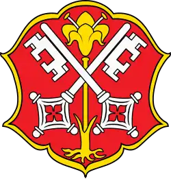 Blasonierung: „In Rot zwei schräg gekreuzte silberne Schlüssel, denen eine aufrechte, bewurzelte goldene Lilie unterlegt ist.“[7] |