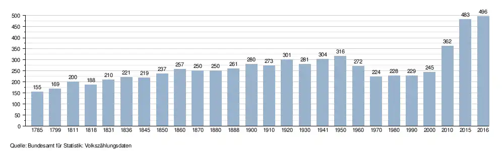 - ↑ Daten der Eidgenössischen Volkszählungen ab 1850 nach Gemeinden. (XLSX; 10 MB) Bundesamt für Statistik, Neuchâtel, 12. Juli 2024, abgerufen am 14. September 2025 (Öffnung in Excel nur über "Anhang/Excel-Datensatz" möglich).