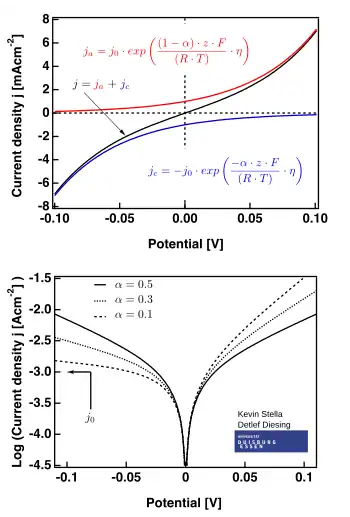 Die untere Abbildung zeigt den Logarithmus des Betrags der Stromdichte für verschiedene Ladungstransferkoeffizienten .
