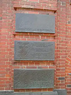 Der Rat der Stadt Buxtehude beschloss am 19. April 2016 die symbolische Wiedergutmachung der Hexenprozesse in Buxtehude durch die Errichtung eines Mahnmals am Historischen Rathaus. Seit November 2017 erinnern dort drei Bronzetafeln an die historischen Ereignisse.[15]