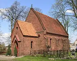 - Die Friedhofskapelle St. Hedwig (Kaplica cmentarna św. Jadwigi) wurde im 14. Jahrhundert als Saalkirche im gotischen Stil erbaut. Erstmals erwähnt wurde sie 1383. Die dreijochige Kirche besitzt im Inneren eine Flachdecke und eine tonnengewölbte Sakristei an der Nordseite. Im Westen befindet sich die Vorhalle mit einem Kreuzgratgewölbe. Der Westgiebel entstand um 1600.[2]*