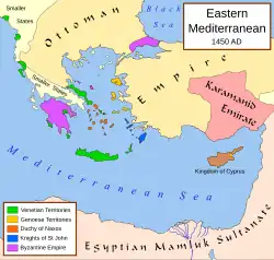 Nach der Einnahme von Konstantinopel nahmen die Osmanen 1460 Morea und 1461 Trepezunt ein.[20] Mit dem Fall von Trapezunt kam das endgültige Ende Ostroms und des letzten Nachfolgerstaats des Römischen Reiches. Die Palaiologen wurden von den Königshäusern Europas bis zum 16. Jahrhundert als rechtmäßige Kaiser von Konstantinopel anerkannt, bis schließlich die Reformation, die osmanische Bedrohung Europas und das nachlassende Interesse an Kreuzzügen die europäischen Mächte dazu zwangen, das Osmanische Reich als Herrscher über Anatolien und der Levante anzuerkennen. Die byzantinische Herrschaft in ihrem früheren Herrschaftsbereich endete vollständig nach der Eroberung mehrerer großer Rumpfstaaten: dem Fall von Trepezunt 1461, dem Fürstentum Theodoro 1475 und dem Despotat Epirus (damals unter der Familie Tocco) 1479.[21]