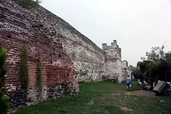 Für Türme befinden sich an der West- und Ostmauer dreieckige Auskragungen, während an den höchsten Punkten und insbesondere im Teil, der die Akropolis von der Stadt trennt, rechteckige Türme stehen. Derzeit befinden sich etwa 50 Türme auf den Mauern. Unter diesen sind die wichtigsten aus der byzantinischen Zeit: im Westen der Turm von Claudianus, im Süden der Turm von Anaglyphos, im Osten der Turm des oben erwähnten Ormisdas (5. Jahrhundert n. Chr.) und an der nördlichen Mauer der Turm von Andronikos Lapardas und der Turm von Manuel Palaiologos. Zu den Ergänzungen der osmanischen Zeit zählt neben dem erwähnten Weißen Turm als weiterer zylindrischer Turm der Alyssa-Turm oder Trigonion-Turm am nordöstlichen Ende (15. Jahrhundert). Am südwestlichen Ende errichteten die Osmanen an der Vardari-Festung den polygonalen Turm von Top Hane.[6]