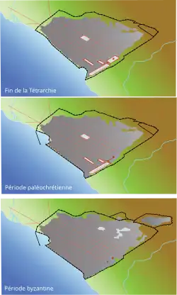 Im 3. Jahrhundert n. Chr. wurden zum Schutz der Stadt vor den Goten Befestigungsanlagen mit Materialien aus Vorgängerbauten errichtet. Mit diesen Befestigungen konnten zwei gotische Angriffe in den Jahren 254 und 268 abgewehrt werden. Die römische Mauer war einteilig, 1,65 m breit und hatte quadratische Türme.[7] Die Hauptstraße der Stadt (Leoforos oder Mesi) erstreckte sich vom Goldenen Tor im Westen (Vardari-Platz) bis zum Kassandreotischen Tor im Osten (siehe auch Karte). Die Südmauer befand sich südlich der heutigen Tsimiski-Straße.
