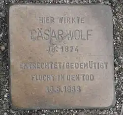 Bereits wenige Wochen nach der Machtübergabe an die Nationalsozialisten am 30. Januar 1933 betraf die antisemitische Politik auch Cäsar Wolf persönlich. Anfang Mai 1933 verwehrte ihm ein Uniformierter den Zutritt zum Elisabeth-Krankenhaus. In der Nacht vom 12. auf den 13. Mai 1933 erschoss sich Wolf unmittelbar vor dieser Klinik. Die Beisetzung fand am 14. Mai 1933 auf dem Hauptfriedhof Ohlsdorf bei Planquadrat G 5 südlich der Bergstraße statt.[4]