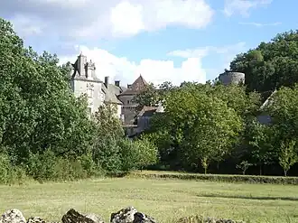 - Das aus dem 13. bis 16. Jahrhundert stammende Schloss (château) liegen auf einem Felsvorsprung über dem Fluss Lot und dennoch beinahe versteckt im Wald. Der verwinkelte Komplex vermittelt – trotz späterer Hinzufügungen und der vielen Renaissance-Rechteckfenster – einen spätmittelalterlichen Eindruck. Im Innern wurden bei Restaurierungsarbeiten Malereien des 16. Jahrhunderts entdeckt. Der Bau wurde bereits im Jahre 1957 als Monument historique anerkannt.[1]