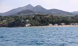 Die Plage du Racou im Süden von Argelès-sur-Mer; auf der Bergspitze im Hintergrund der Tour de Madeloc