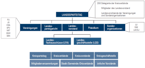 Das oberste politische Organ der CDU Sachsen ist der Landesparteitag. Er setzt sich zusammen aus dem Landesvorstand, den Vorsitzenden oder Stellvertretern der Vereinigungen und Sonderorganisationen sowie 200 Delegierten der Kreisverbände. Die insgesamt etwa 230 bis 240 stimmberechtigten Mitgliedern wählen den Landesvorstand, das Präsidium und das Landesschiedsgericht.[16]