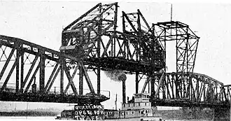 Der von Joseph Baermann Strauss entworfene Hubbrückentyp (direct lift) ist eine seltene Bauform, die im Gegensatz zur üblichen Konstruktion ohne Seilzugsystem auskommt; die Hubhöhe ist dafür aber eingeschränkt. Die Bewegung des Brückenträgers geschieht wie bei der Strauss-Klappbrücke ausschließlich über Hebelarme, wobei die Gegengewichte über ein bewegliches Rahmengestell in Form eines Parallelogramms mit dem Brückenträger verbunden sind. Der jeweilige Drehzapfen (engl. trunnion) befindet sich in der Mitte der unteren Seite des Parallelogramms und durch die Beweglichkeit des Rahmengestells ist eine rein vertikale Bewegung des Brückenträgers möglich. Angetrieben wurde der Hubmechanismus über einen Elektromotor,[10] der unterhalb der Gleisebene im beweglichen Brückenträger positioniert ist und über ein Getriebe und Gestänge vier Stirnräder an den Enden des Trägers antreibt. An den Innenseiten der senkrechten Ständer auf den Brückenpfeilern, die das Rahmengestell tragen, sind an den Innenseiten Zahnstangen angebracht, in die die Stirnräder eingreifen und so die Hebung und Senkung des ausbalancierten Systems aus Brückenträger und Gegengewichten mit wenig Kraftaufwand ermöglichten. Die Stahlkonstruktion wiegt 580 t,[8] die Spannweite beträgt hier 30,5 m und die Hubhöhe 12,2 m.[4][11]