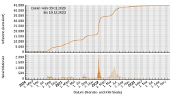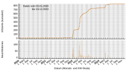 Eine erste SARS-CoV-2-Welle gab es Mitte März bis Ende April; dann war die Zahl der Neuinfektionen gering. Anfang September begann eine zweite Welle (Höhepunkt Ende Oktober).Am 27. September wurden fast 3000 Neuinfektionen an einem einzigen Tag gemeldet. Ab dem 29. September galten deshalb etwas schärfere Corona-Regeln.[15] In der 41. Kalenderwoche waren es 36.333 Neuinfektionen; Ende Oktober wurden an einem Tag über 10.000 Neuinfektionen registriert. Durch Lockdownmaßnahmen sank diese Zahl im November auf unter 5.000 pro Tag.