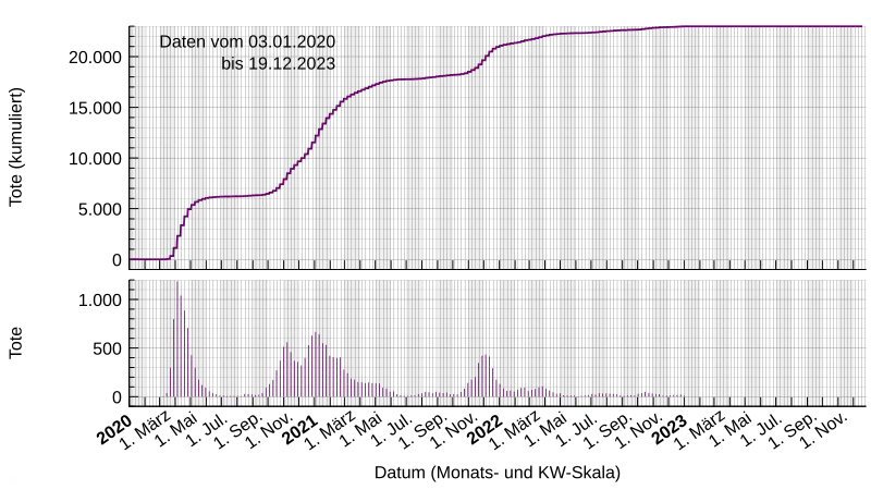 Bestätigte Todesfälle nach Daten der WHO; oben kumuliert, unten Tageswerte[66][Anm. 1][Anm. 2][Anm. 3]
