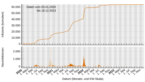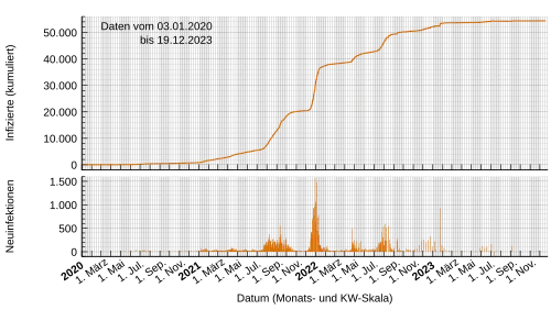 Am 26. März 2020 waren drei Infizierte bekannt, die sich zuvor in Südafrika aufgehalten hatten. Das Gesundheitsministerium empfahl die Einhaltung von Hygieneregeln und riet den Infizierten vom Besuch von Veranstaltungen und öffentlichen Räumen ab.[38]