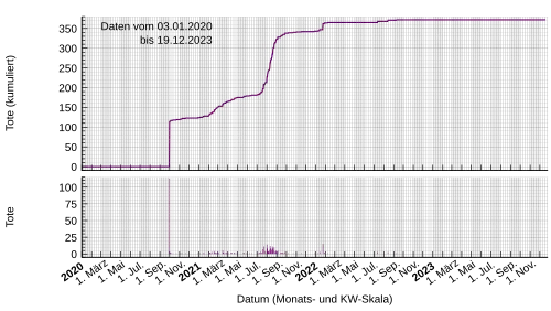 Von Ende Mai bis zum 25. Juni 2020 wurden der WHO weniger als 190 Neuinfektionen pro Tag gemeldet. Seit dem 4. Juli werden über 400 Neuinfektionen pro Tag gemeldet und jeden Tag fast 3 Prozent mehr als am Vortag.[17] Bei einer solchen Steigerungsrate verdoppelt sich die Zahl der Infizierten alle 25 Tage.
