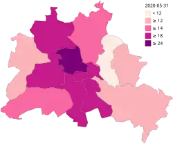 - ↑ COVID-19 in Berlin, Verteilung in den Bezirken – Gesamtübersicht | Offene Daten Berlin. Abgerufen am 14. Oktober 2020.