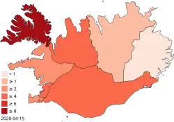 Am 15. März wurde berichtet, dass sich drei COVID-19-Patienten in Island jetzt im Krankenhaus befinden, einer davon auf der Intensivstation, und dass eine Gesundheitsklinik im Hauptstadtbereich (in Mosfellsbær) geschlossen wurde, nachdem ein Mitarbeiter positiv auf COVID-19 getestet wurde. Insgesamt wurden 171 Fälle bestätigt, von denen die meisten auf Skigebiete in den Alpen zurückgeführt werden können. Der Chefepidemiologe Þórólfur Guðnason stellte fest, dass die Hälfte aller Personen in Island, die positiv auf das Coronavirus getestet wurden, sich bereits selbst unter Quarantäne gestellt haben (nachdem sie entweder von internationalen Reisen nach Hause zurückgekehrt waren oder mit einer infizierten Person in Kontakt gekommen waren), was darauf hindeutet, dass Maßnahmen zur Kontrolle des Ausbruchs durch Quarantäne und Isolation in Island bisher wirksam waren.[28] Schätzungsweise 2500 Personen isolieren sich selbst, wobei die Zahl täglich steigt.[29]