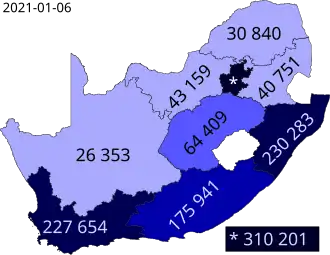 Die COVID-19-Pandemie in Südafrika ist ein regionales Teilgeschehen der weltweiten COVID-19-Pandemie. Ursache ist das Ende 2019 neu aufgetretene Virus SARS-CoV-2 aus der Familie der Coronaviren. In Südafrika zur Jahresmitte 2020 die erste COVID-Welle, um den Jahreswechsel 2020/2021 die zweite, im Spätsommer 2021 die dritte und seit Anfang Dezember 2021 eine von der Omikron-Variante verursachte Welle (siehe Grafiken unten). Silvester 2021 äußerte die Regierung, die Höhepunkt dieser Welle sei überschritten. Die Zahl der Neuinfektionen in Südafrika war in zuvor um fast 30 Prozent im Vergleich zur Vorwoche gesunken und die Zahl der Krankenhauseinweisungen wegen COVID war in acht der neun Provinzen rückläufig. Die Regierung hob zu Silvester die seit fast zwei Jahren geltende nächtliche Ausgangssperre und weitere Einschränkungen des öffentlichen Lebens auf.[2]