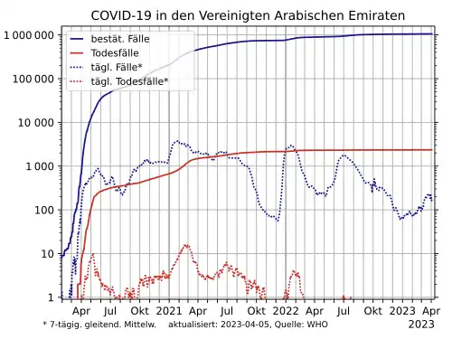 Bis zum 5. April 2020 wurden von der WHO 1505 COVID-19-Fälle und zehn Todesfälle in den Vereinigten Arabischen Emiraten bestätigt.[5]