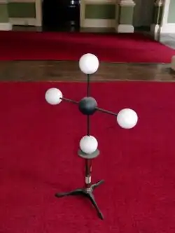 August Wilhelm von Hofmann war offenbar der erste, der Molekülmodelle in der organischen Chemie verwendete, nachdem August Kekulé 1858 die chemische Strukturtheorie und Alexander Crum Brown 1861 die gedruckten Strukturformeln eingeführt hatten. Bei einem Freitagabendvortrag in der Londoner Royal Institution am 7. April 1865 zeigte er Molekülmodelle einfacher organischer Substanzen wie Methan, Ethan und Methylchlorid, die er aus verschiedenfarbigen Tischkrocketbällen konstruiert hatte, die mit dünnen Messingröhrchen miteinander verbunden waren.[1] Das ursprüngliche Farbschema von Hofmann (Kohlenstoff = schwarz, Wasserstoff = weiß, Stickstoff = blau, Sauerstoff = rot, Chlor = grün und Schwefel = gelb) hat sich zu den späteren Farbschemata weiterentwickelt.[2]