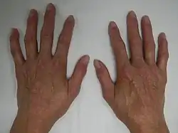 Das CREST-Syndrom ist eine Sonderform der limitierten kutanen Systemischen Sklerose und gehört damit zur Gruppe der Autoimmunerkrankungen.[1] Das Akronym steht für die Hauptmerkmale Calcinose, Raynaud-Syndrom, gestörte Peristaltik im Ösophagus (Esophagus), Sklerodaktylie und Teleangiektasie.[2][3][4]