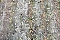 - Je nach eingesetzter Technik scheint es Probleme mit klebrigem Boden beziehungsweise bei Applikation im Morgentau zu geben[31]. Zudem kann es zu Mindererträgen in Fahrspuren kommen[32].