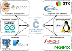 Trotz des eher hohen Alters ist die Sprache C auch heute weit verbreitet und wird sowohl im Hochschulbereich als auch in der Industrie und im Open-Source-Bereich verwendet.[10]