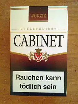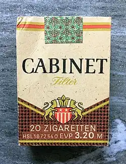 Cabinet-Zigaretten wurden in der DDR 1972 eingeführt und vom Volkseigenen BetriebVEB Tabak Nordhausen wie auch von den Vereinigten Zigarettenfabriken Dresden produziert (beide bis 1990 im Kombinat Tabak). Vor der Wende lag die monatliche Produktion bei etwa 800 Millionen Zigaretten und der Marktanteil lag 1989 bei 33 Prozent.[1] Nach der Wende übernahm zunächst Reemtsma die Produktion, der Marktanteil sank auf zehn Prozent ab. Die Produktion fand bis Ende der 1990er Jahre in Nordhausen statt, dann wurde der Standort geschlossen und die Produktion im Stammwerk Langenhagen fortgesetzt. Hier wurden dann auch neue Varianten eingeführt und der Geschmack verändert. Die Marke wurde vor dem Tabakwerbeverbot im Fernsehen, im Kino, auf Plakaten etc. mit dem Slogan „Von Mensch zu Mensch“ beworben. Tabakwerbung ist heute in Deutschland nur noch am Verkaufsort erlaubt und dort wird der Slogan weiterhin benutzt. Heutzutage ist nur noch die Sorte Cabinet Original, welche von Cabinet Würzig umbenannt wurde erhältlich, aufgrund von EU-Richtlinien, die verharmlosende Begriffe, wie „Würzig“, „Mild“ oder „Naturrein“ verbieten. Cabinet ist aktuell in drei Packungsgrößen erhältlich: 20 Stk., 26 Stk. und 43 Stk., die 2025 angepasst wurden. Zuvor waren es 20 Stk., 27 Stk. und 45 Stk.