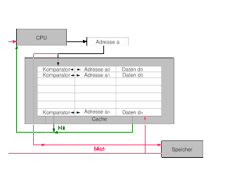- ↑ Ein 16-fach assoziativer 16 MByte-Cache bei unterstützten 128 GByte muss hier z. B. die Adressbits 37 bis 20 (insgesamt 18 bit) speichern.