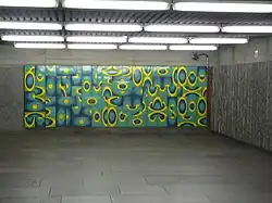 In den beiden Zugangstunnels zu den Eingangspavillons ist je ein Wandbild von Jean Cartier zu finden. Die abstrakten Werke bestehen aus gebranntem Email auf Stahlplatten und sind jeweils 5 Meter breit und 1,7 Meter hoch. Während auf der Nordseite Blautöne vorherrschen, sind es auf der Südseite Orangetöne. Die rechteckigen Segmente können entfernt und neu angeordnet werden, so dass sich jeweils ein neues Muster ergibt.[3]