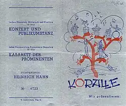 - ↑ Diele nimmt Bezug auf jene Jahre, in denen die Koralle sich als Wein-Diele bewarb. – Siehe: KORALLE, die stimmungsvolle Wein-Diele. In: Wiener neueste Nachrichten, Nr. 6751/1941 (XVII. Jahrgang), 15. Dezember 1941, S. 5, Mitte unten. (online bei ANNO).