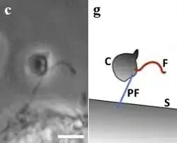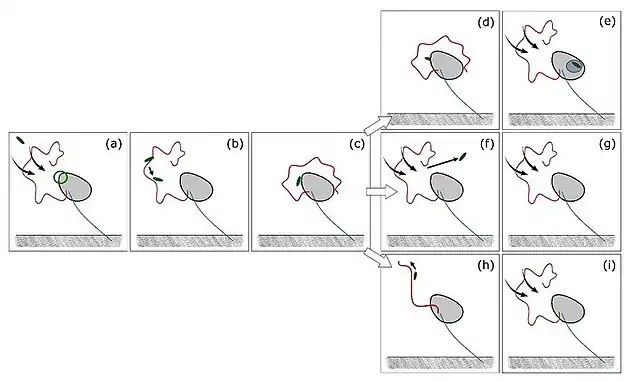 Schematische Darstellung der Nahrungssuche von Cafeteria cf. mylnikovii (früher Pseudobodo cf. tremulans); Bezeichnungen wie oben, zusätzlich h–i: Peitschen-Abstoßung (lash rejection). Die vordere Geißel dient als „Peitsche“.