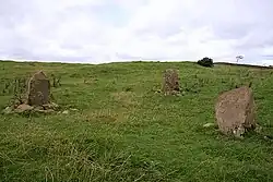 Die Ausgrabung, als Reaktion auf den Umsturz eines der drei Steine hat gezeigt, dass die Stätte aus einem ovalen Cairn besteht, in dem die Menhire (englisch Standing stones) stehen. Der Stumpf des vierten Pfostens wurde im Steinhaufen entdeckt. Unter dem Cairn wurde eine kleine Einäscherung freigelegt. Zu den dort gemachten Funden gehören eine Kragenurne (englisch Collared urn), eine Kordonurne (englisch Cordoned urn) und eine Schale.