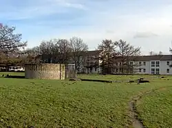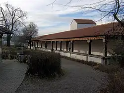 Als einziges Wohnhaus konnte ein Gebäude mit der Größe von 5,5 × 9,5 m[22] sicher nachgewiesen werden. Ein größerer Bau mit zwei Apsiden (freigelegter Innenraum 11,4 × 18,4 m[23], nach anderen Angaben 13,2 × 20,6 m[24]) konnte nur in seinem südlichen Teil ergraben werden. Die Deutung schwankt zwischen einem Bade-[25] und einem Empfangsgebäude ähnlich der Aula im Kastell Kellmünz.[26] Mangels Belegen und wegen Abweichungen in der Bauweise wurde eine ältere Annahme, dass es sich um eine spätrömische (Bischofs-)Kirche handeln soll, verworfen.[27]