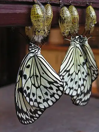 ![]() Frisch geschlüpfte Baumnymphen-Falter (Idea) im Cambridge Butterfly Conservatory | |||